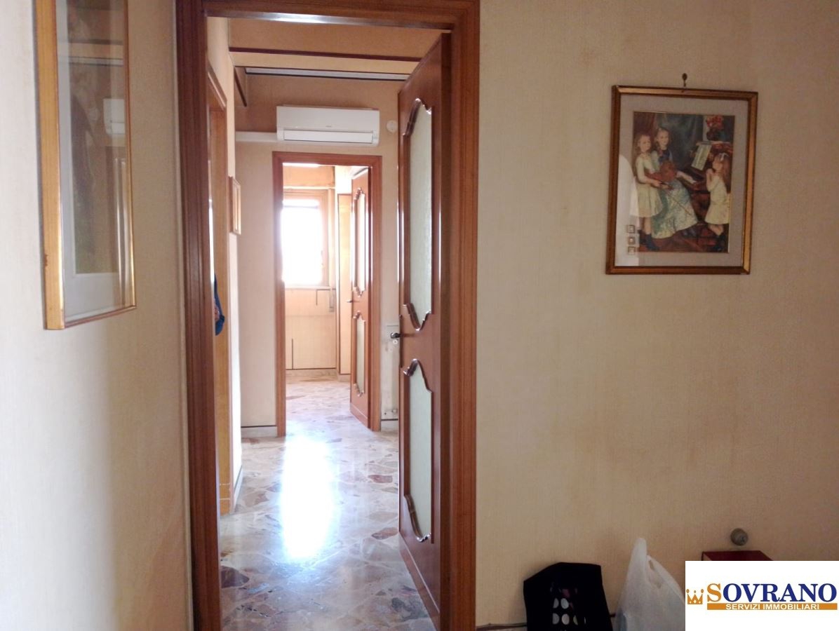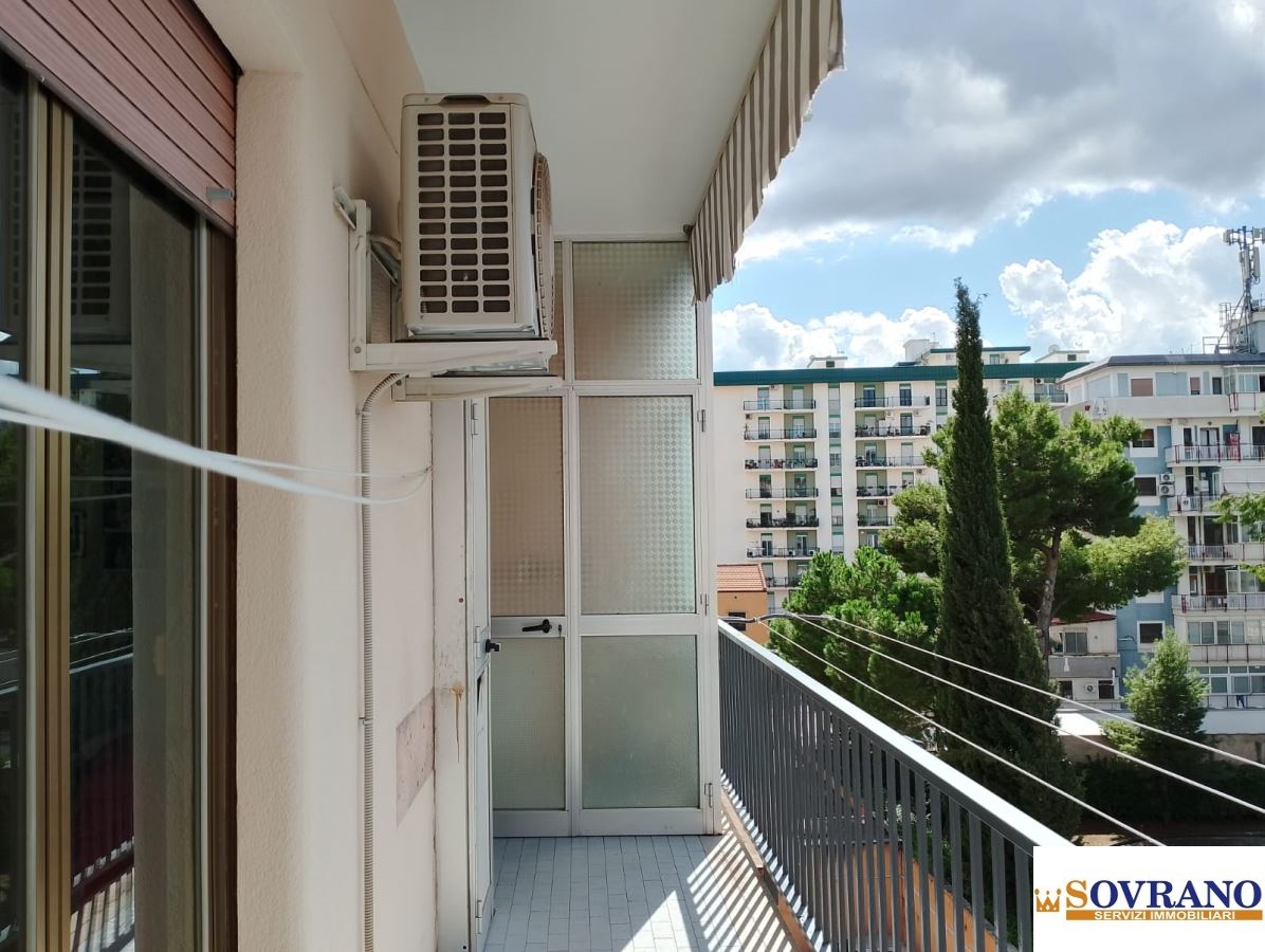 L'ingresso introduce a un salone doppio, spazioso e arioso, impreziosito da due ampie aperture che affacciano sul balcone principale, ideale per vivere appieno la vita cittadina con uno sguardo dall'alto. La cucina, funzionale e separata, si affaccia su un secondo balcone, regalando ulteriore respiro alla zona giorno. La zona notte comprende due camere da letto, una camera singola perfetta come studio o stanza per gli ospiti, un pratico camerino, un bagno con doccia finestrato. L'abitazione si presenta in buono stato. Tra le dotazioni: porta d'ingresso blindata, infissi in alluminio, porte interne in legno con inserti in vetro e un condizionatore già installato per garantire il massimo comfort.