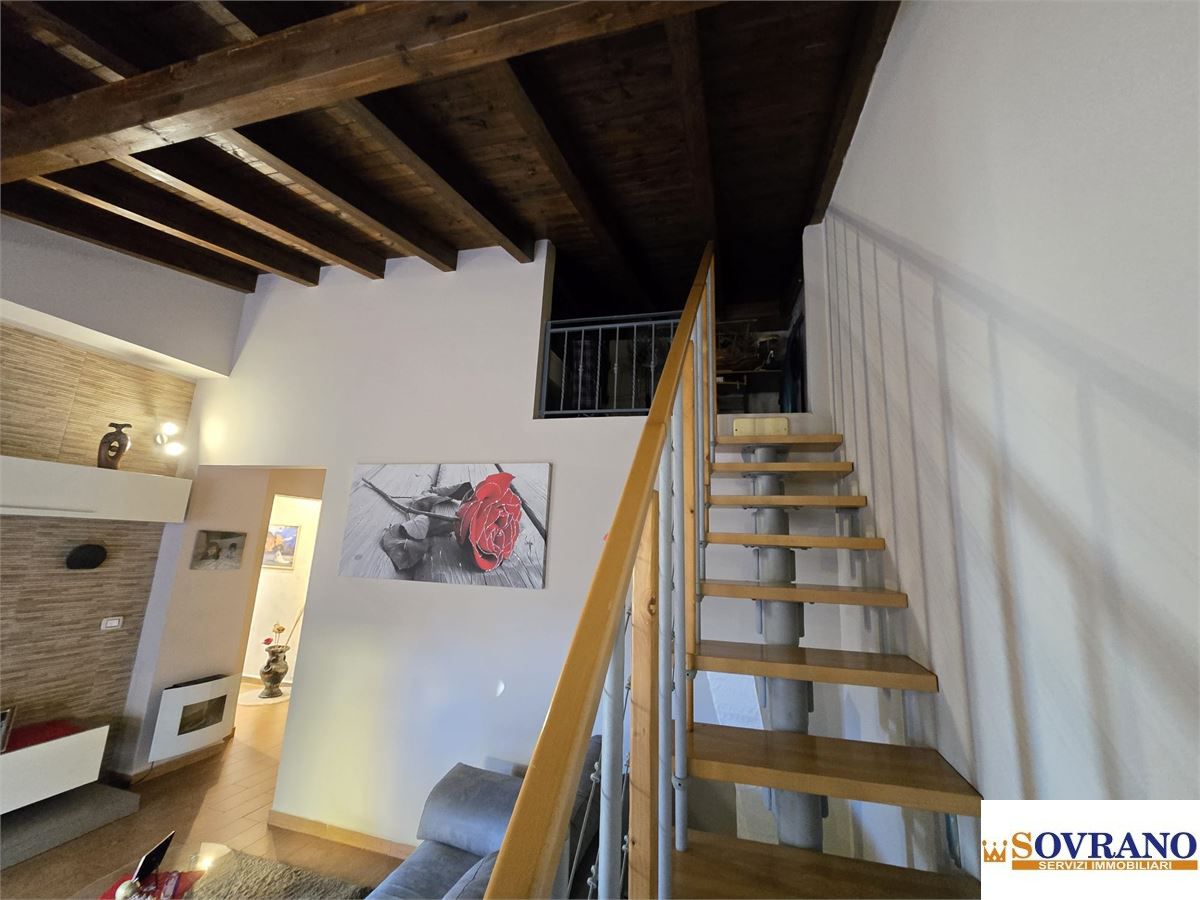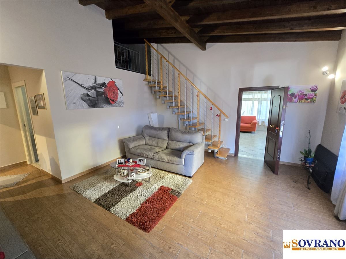 La distribuzione interna è razionale e ben studiata, con un doppio ingresso che conduce rispettivamente alla cucina abitabile e all'ampio salone, un soggiorno arricchito da un suggestivo soppalco che dona carattere e luminosità all'ambiente. La zona notte ospita due camere da letto matrimoniali, di cui una con bagno privato con doccia, una cameretta e un secondo bagno con doccia e funzione lavanderia. Dalla cucina si accede direttamente a un comodo porticato e a un ampio terrazzo di circa 100 mq, ideale per momenti di relax all'aperto o per vivere gli spazi esterni in ogni stagione.