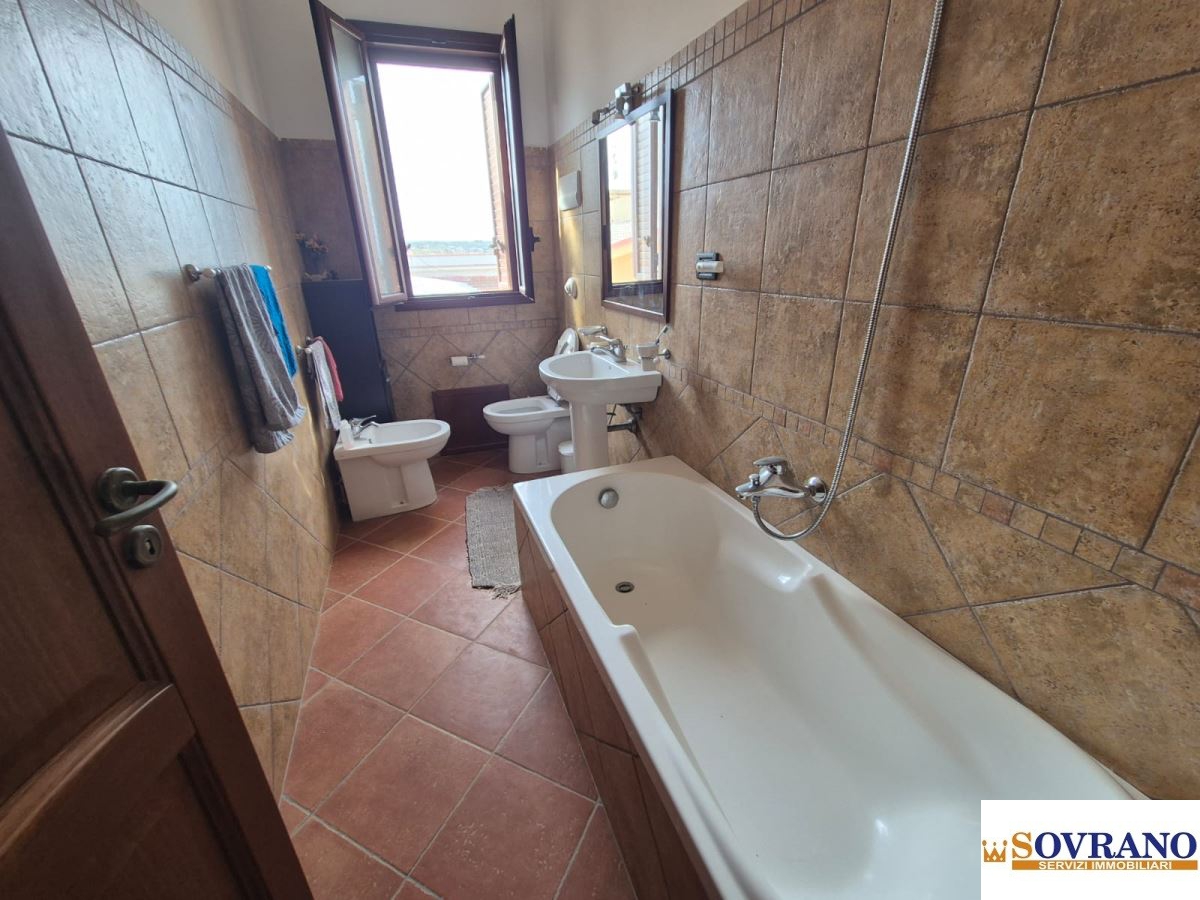 Una elegante scala interna conduce al piano superiore, dove si trovano un disimpegno, due camere da letto, un ripostiglio e un bagno con vasca.